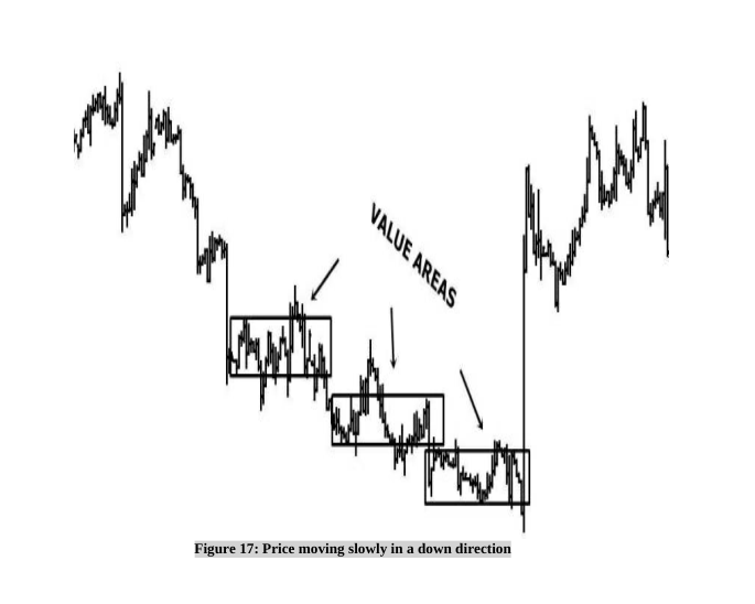 지금까지 저는 가격의 가치를 시장이 가장 많은 시간을 거래한 지역이라고 설명해 왔습니다. 공급이 수요를 충족시키고 결과적으로 가격이 옆으로 움직이며 가치의 공급과 수요 사이에서 위아래로 움직입니다. 하지만, 저는 그곳이 또한 많은 양의 거래가 발생하는 곳이라고 말했습니다. 수요와 공급이 완전히 균형을 이루지 않더라도 가격 변동은 금융 상품에 가치를 부여할 수 있습니다. 약간의 불균형이 있다면, 만약 수요보다 공급이 조금 더 크다고 가정해 보자면,, 가격 어떻게 움직일까요? 글쎄요, 그것은 시장이 약세이고 판매자들이 가격을 천천히 내리고 있다는 것을 의미합니다. “천천히”가 핵심입니다.